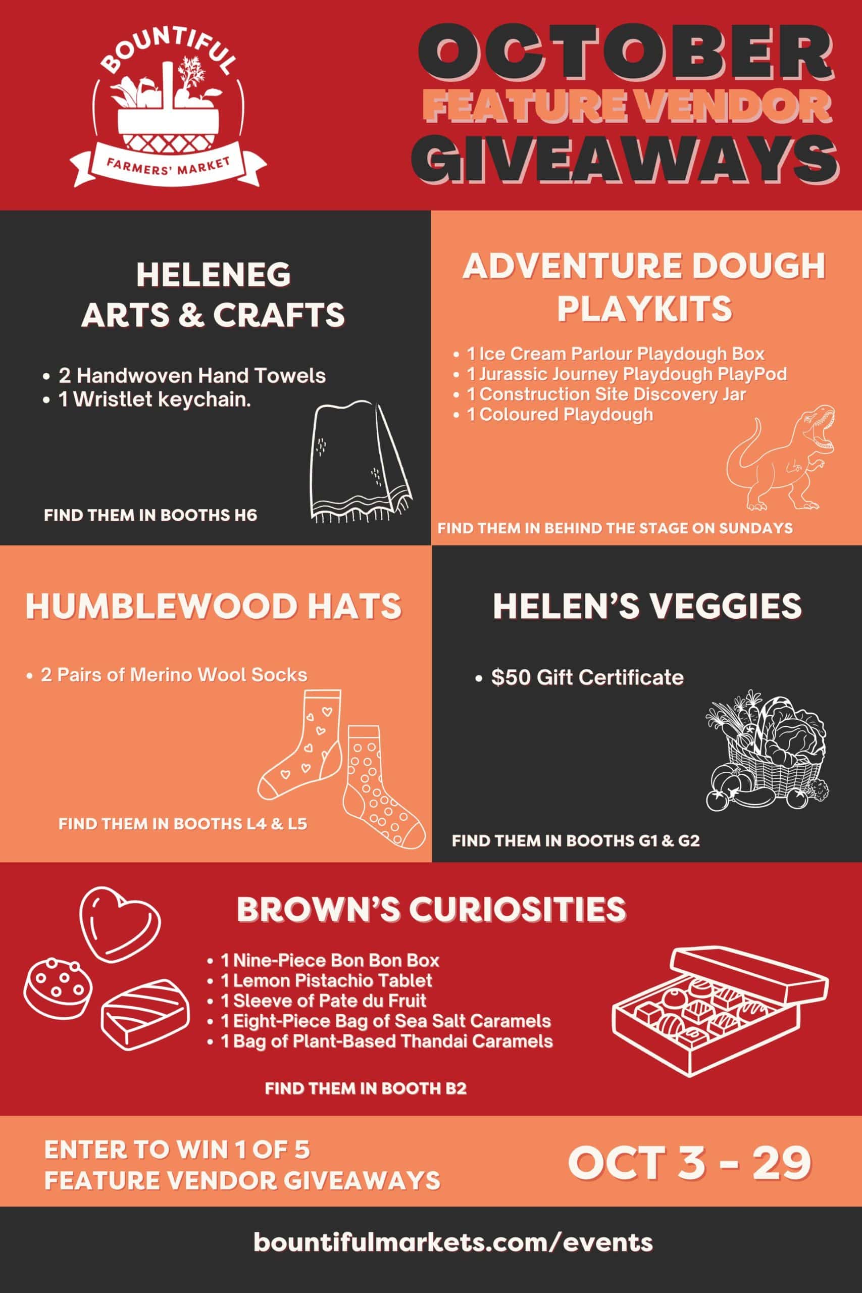 Bountiful Farmers' MarketWe're thrilled to announce our October Gift Basket Giveaway, featuring 5 of Bountiful's vendors! Customers can enter from October 3th - October 26th. Here’s your chance to win one of five incredible gift baskets, each lovingly curated by one of Bountiful's local vendor. From artisanal treats to handcrafted goodies, these baskets are packed with the […]