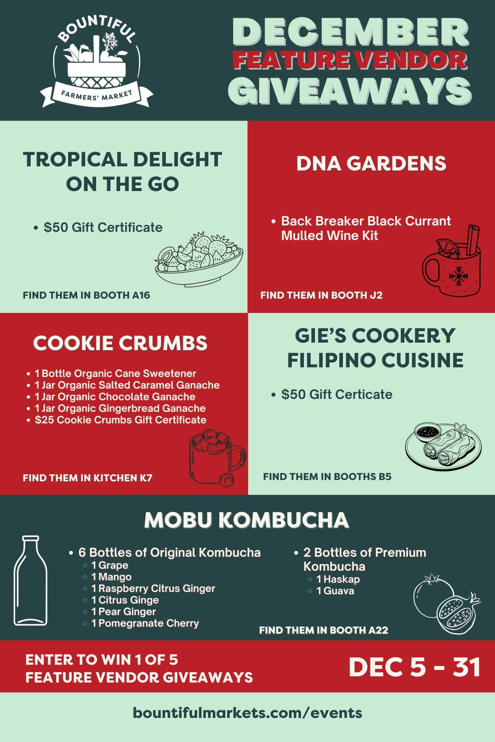 Bountiful Farmers' MarketWe're thrilled to announce our December Gift Basket Giveaway, featuring 5 of Bountiful's vendors! Customers can enter from Decmber 5th - 28th. Here’s your chance to win one of five incredible gift baskets, each lovingly curated by one of Bountiful's local vendor. From artisanal treats to handcrafted goodies, these baskets are packed with the best […]